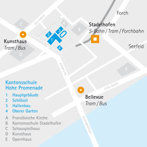 Das Schulhaus liegt für eine gymnasiale Bildungsinstitution optimal im Hochschulquartier zwischen Universität, ETH, Kunst- und Opernhaus. Das Areal ist somit auch über den Bahnhof Stadelhofen und das Bellevue sowie mit dem Parkhaus Hohe Promenade verkehrstechnisch hervorragend erschlossen.