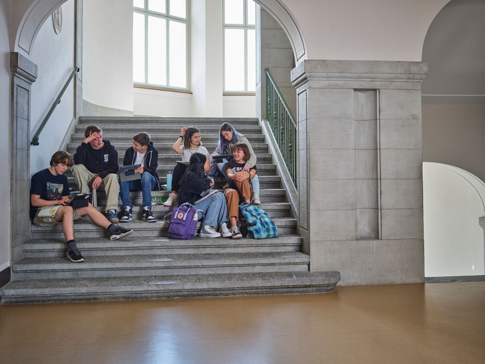 2324 Quadratmeter Fensterfläche, zwei Brunnen in den Korridoren, über 20'000 Medien zur Ausleihe, ein echter Giacometti (Augusto), vier Flügel, 3.80 Meter hohe Denkräume, eine Villa namens Oberer Garten für Bildnerisches Gestalten. Was für ein Schulhaus!
