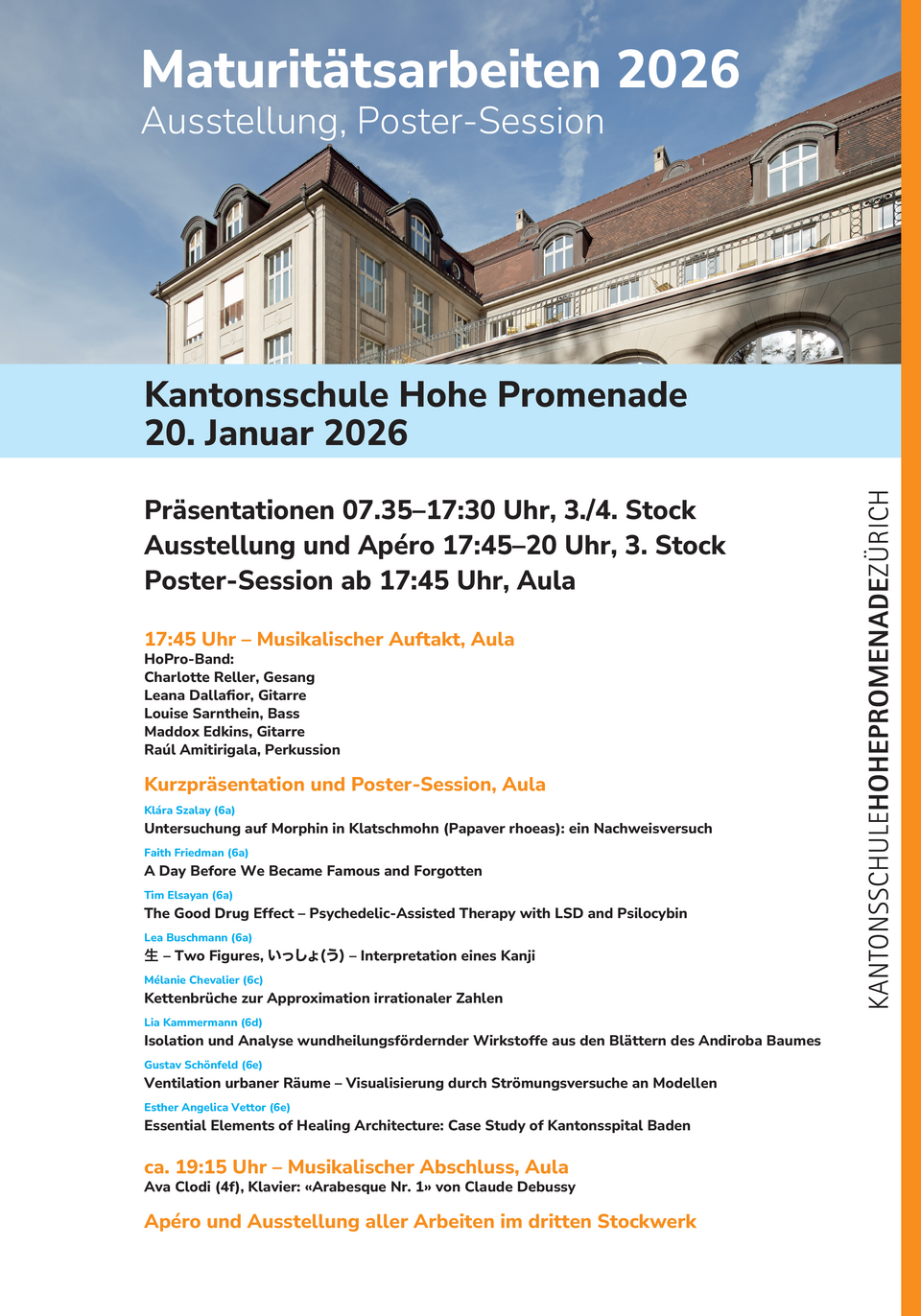 Am Dienstag, 20. Januar 2026, präsentieren die Sechstklässler:innen tagsüber ihre Maturitätsarbeiten. Abends findet in der Aula ab 17.45 Uhr die Poster-Session und im dritten Stock die Ausstellung aller Arbeiten statt. Eltern, Angehörige, Freunde und Interessierte sind herzlich eingeladen. Der Abendanlass wird von einem Apéro begleitet.