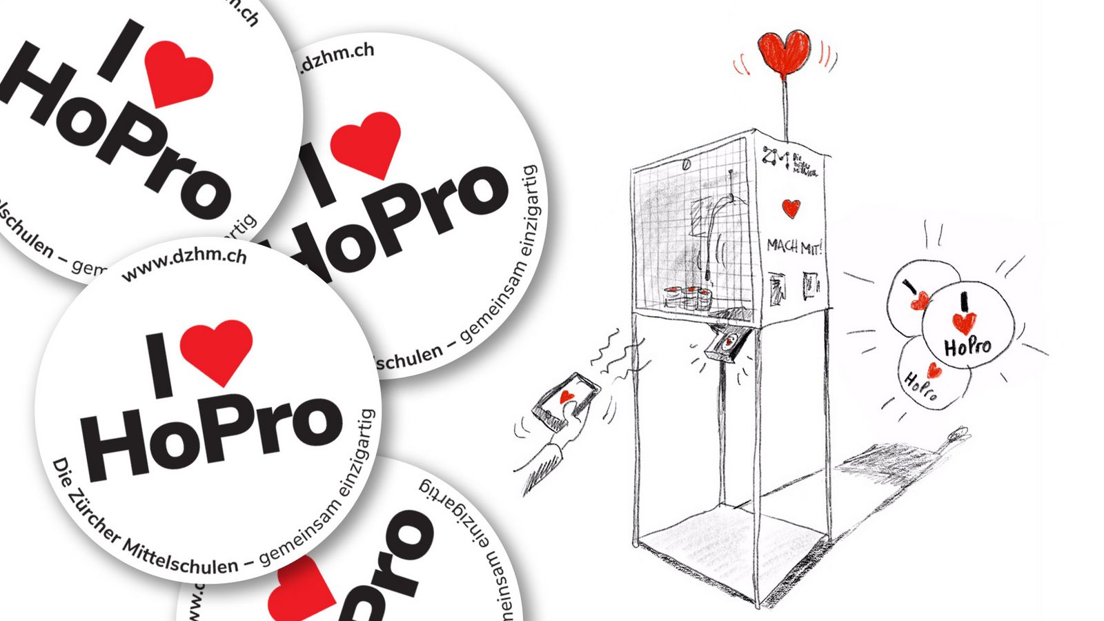 Nach vier Jahren macht die Herzchenmaschine erneut Rast bei uns, wiederum gegenüber dem Eingang zur Mediothek. Mit etwas Geschick können Spielfreudige einen HoPro-Herzkleber gewinnen, mit noch mehr Geschick sogar einen HoPro-GOLD-Kleber. Lasst euch überraschen, wie ihr zu Herzen kommt. Eine Charmeoffensive von www.diezuerchermittelschulen.ch